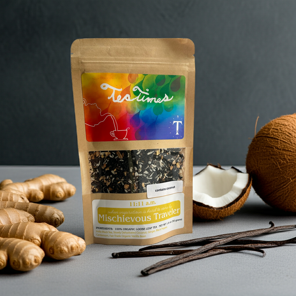 India Black Tea, Slowly Dehydrated Coconut, Cardamom, Black Pepper, Ginger,